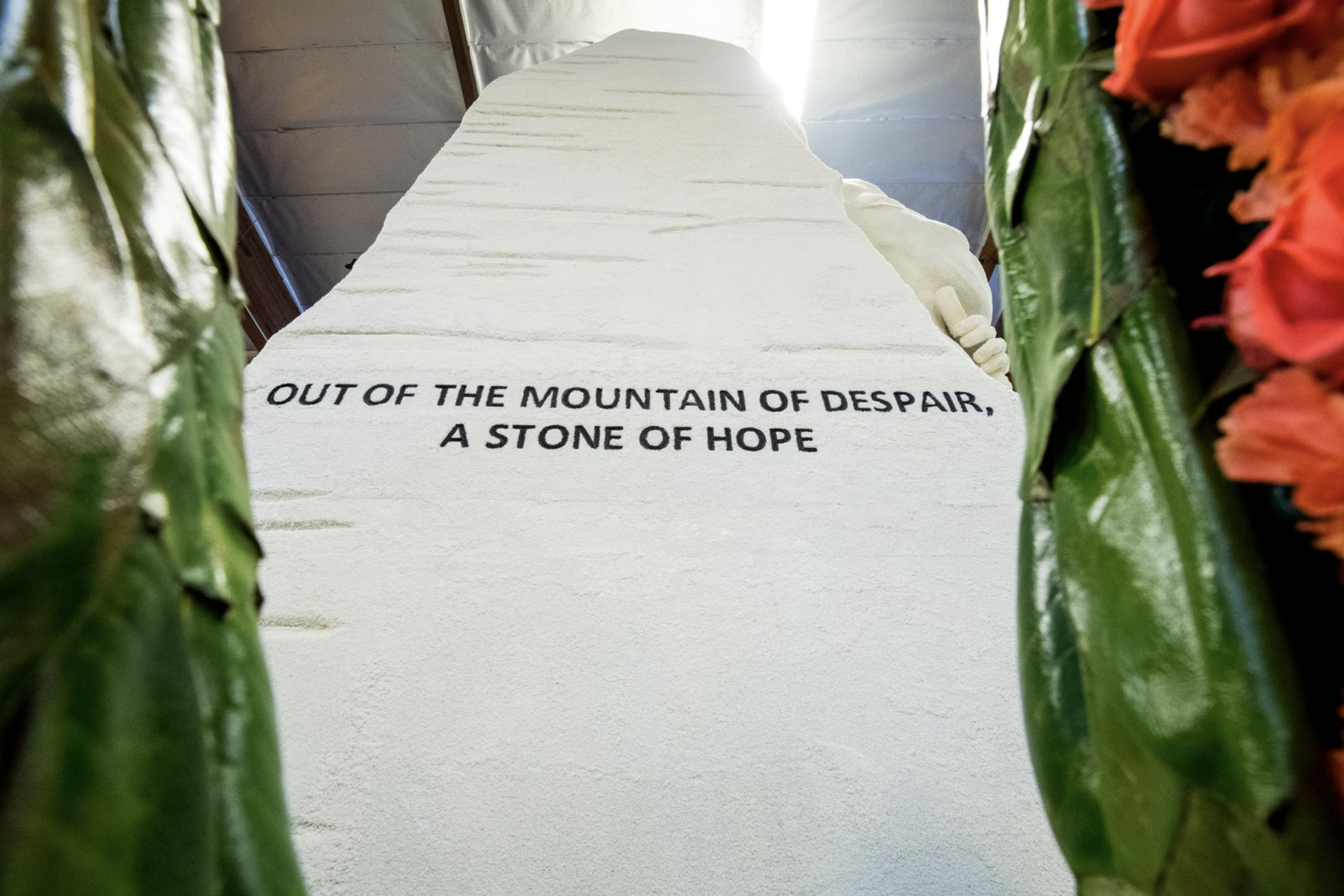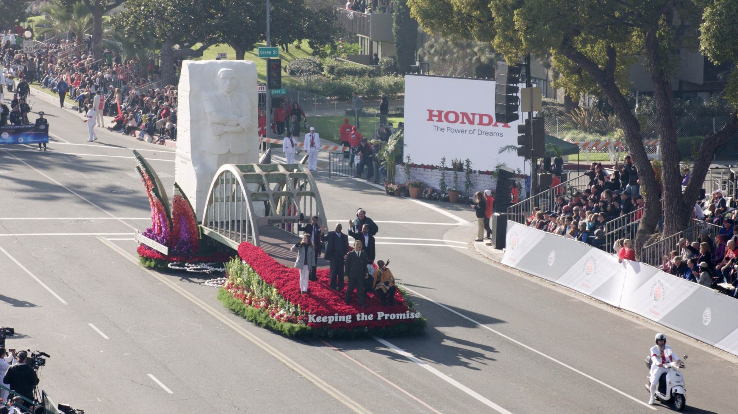 The float showcased a floral replication of Lei Yixin’s “Stone of Hope” granite statue of Dr. King, as well as the Edmund Pettus Bridge, which Dr. King and other civil rights icons marched across in 1965 to protest racist policing.