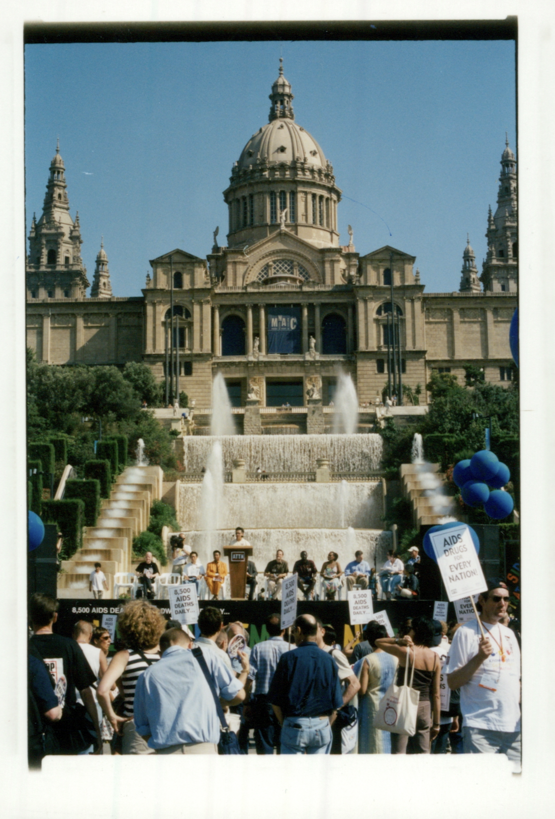 Photo of the speakers at the AIDS Therapeutic Treatment Now! protest on stage in front of the Palau Nacional.
